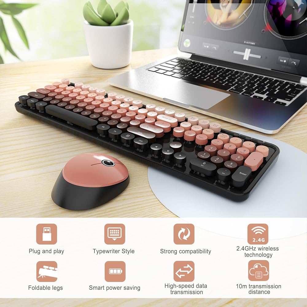 Wireless Keyboard and Mouse Combo, Ergonomic Full Size Typewriter Retro Round Keycaps Keyboard, Compatible with Windows, PC, Perfer for Home and Office Keyboards (Aurora Red)