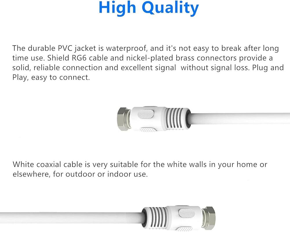 High Quality, the durable PVC jacket is waterproof and it's not easy to break after long-term use. Shield RG6 cable and nickel-plated brass connectors provide a solid, reliable connection and excellent signal without signal loss. Plug and Play, easy to connect.