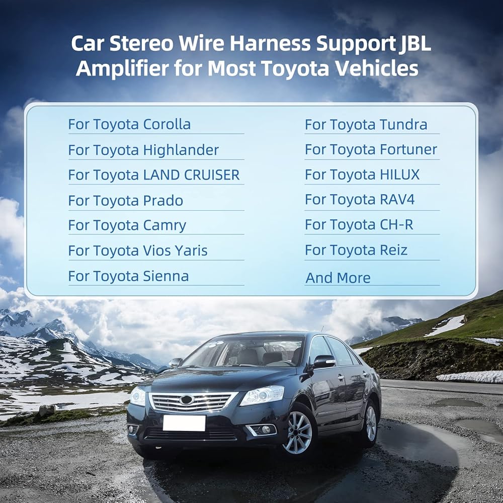 Wide Compatiblity with Toyota Vehicle: The car stereo wire harness support JBL amplifier fit for Toyota Corolla / Toyota Highlander / Toyota LAND CRUISER / Toyota Prado / Toyota Camry / Toyota Vios Yaris / Toyota Sienna / Toyota Tundra / Toyota Fortuner / Toyota RAV4 and more.