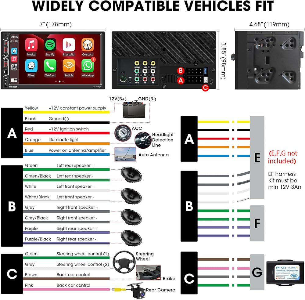 WIDELY COMPATIBLE VEHICLE FIT: Universal standard double din size and rich ports perfectly match with most car. (NOTE: please confirm that your dashboard size is suitable before ordering, if not, you need to buy a suitable dash kit.) Multi-features: Pre-amp and subwoofer outputs, IR remote control, steering wheel controls, Working Voltage: DC 12V, Max power output: 4x 50W