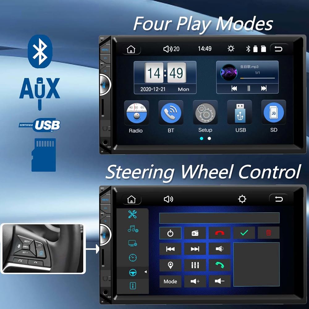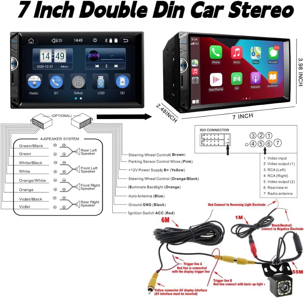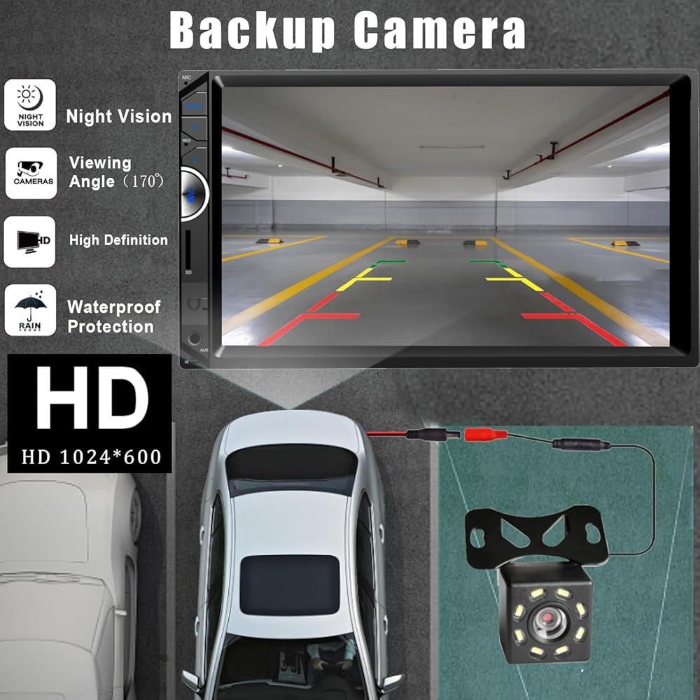 Car Stereo with Backup Camera :Double din car stereo comes with a backup camera,Waterproof, 170-degree super wide-angle lens, night vision, HD display it will automatically display reverse image when in reversing mode. Provide installation tools, wires and user manual. Our car stereo comes with a 1-year warranty and provides professional technical support. If you encounter any operation or other problems, please contact us (click "Contact Seller" on your order page)