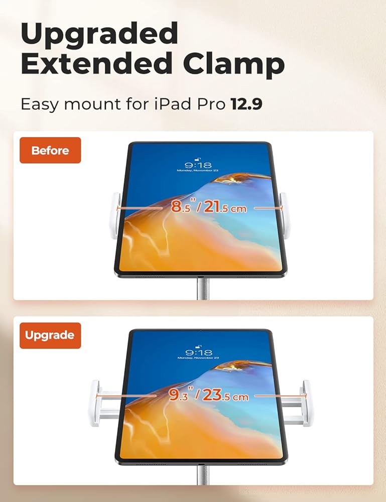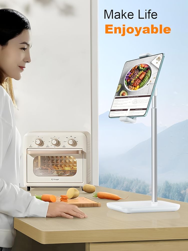 Ergonomic Design: The tablet holder stand is designed for comfortable viewing with adjustable height and angle. The height can be adjusted steplessly from 14.2 to 20.9 inches, allowing you to adjust it to your preferred height and angle.