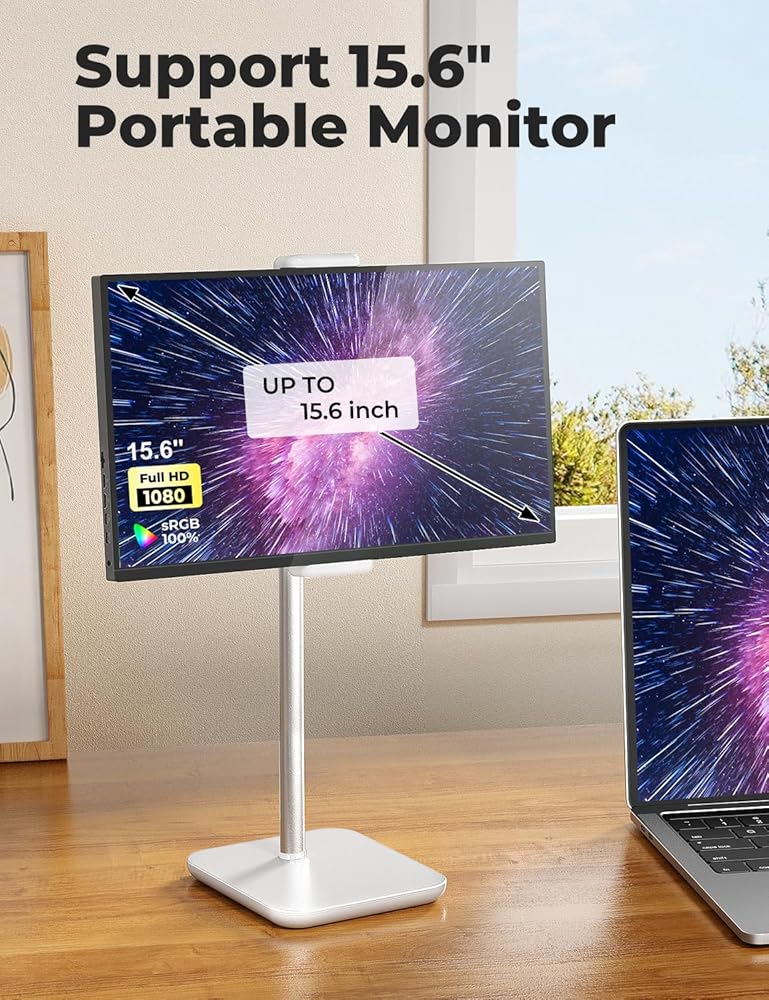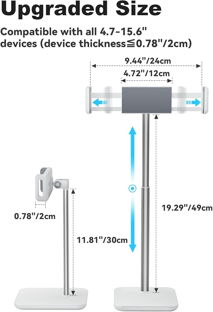 Wide Compatibility: This tablet stand is compatible with various devices, including tablets, smartphones, and displays ranging from 4.7 to 15.6 inches. Its telescopic clip can extend up to 22.5cm from left to right, accommodating different devices. The alloy holder and arm joint allows the clip to rotate 360 degrees in landscape or portrait orientation.