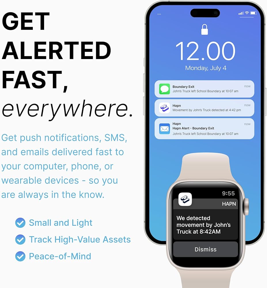 Long-Term Asset Tracker: Ideal for monitoring items and detecting threats of theft. Construction equipment, RVs, boats, valuables in storage, generators and more can easily be tracked. IP67 rated for rugged conditions and protection against weather and dust. Receive location alerts from the GPS tracker powered by the Hapn iOS/Android app.