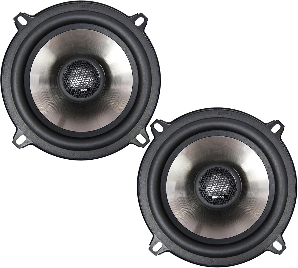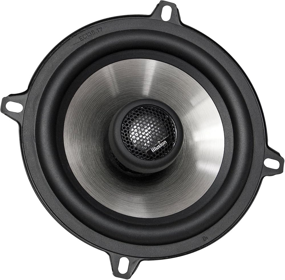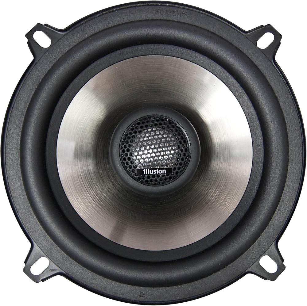 To develop this new Illusion Audio speaker line we combined our decades of experience manufacturing high-end audiophile speakers with our passion for maximum performance mobile audio. The development process covered several years and literally months of listening to each individual model to fine tune musical quality and durability. We applied the highest available technologies in construction materials, Finite Element Analysis engineering and manufacturing to develop speakers that are compact and lightweight for easy installation without making any performance compromises. Our artistic design team has paid careful attention to aesthetics, as we feel they are beautiful speakers too! Aluminum coated injection polypropylene cone with rubber surround powder coated steel basket Free Air Resonance: 81.94 Hz Nominal Impedance: 4 Ohms Sensitivity 2.83 v @ 1 meter: 91.9 Outside Diameter: 130 mm basket + 150 mm ears Mounting Hole Diameter: 117 mm Mount Depth: 61 mm Coaxial Tweeter 4 ohm Integrated 6dB crossover Polyester capacitor Tweeter overload protection Maximum Linear Excursion: ± 2.5 mm Titanium-coated injection polypropylene cone with rubber surround Powder-coated steel basket 26 mm voice coil Driver Specifications: Fs: 81.94 Hz Re: 3.33 Ohms Qms: 4.27 Qes: 0.57 Qts: 0.51 Le: 0.16 mH Vas: 5.35 liter Mms: 8.95 gram Cms: 421 uM/Newton BI: 5.17 Tesla-M SPLref: 91.9 (2.83 volts at 1 meter) Sd: 95 sq cm Xmax: 2.5 mm Xsus: 10 mm Nominal power: 50 Watts Maximum Power: 100 Watts Outside Diameter: 130 mm basket + 150 mm ears Mount Hole: 117 mm Mount Depth: 61 mm Weight: 898 grams