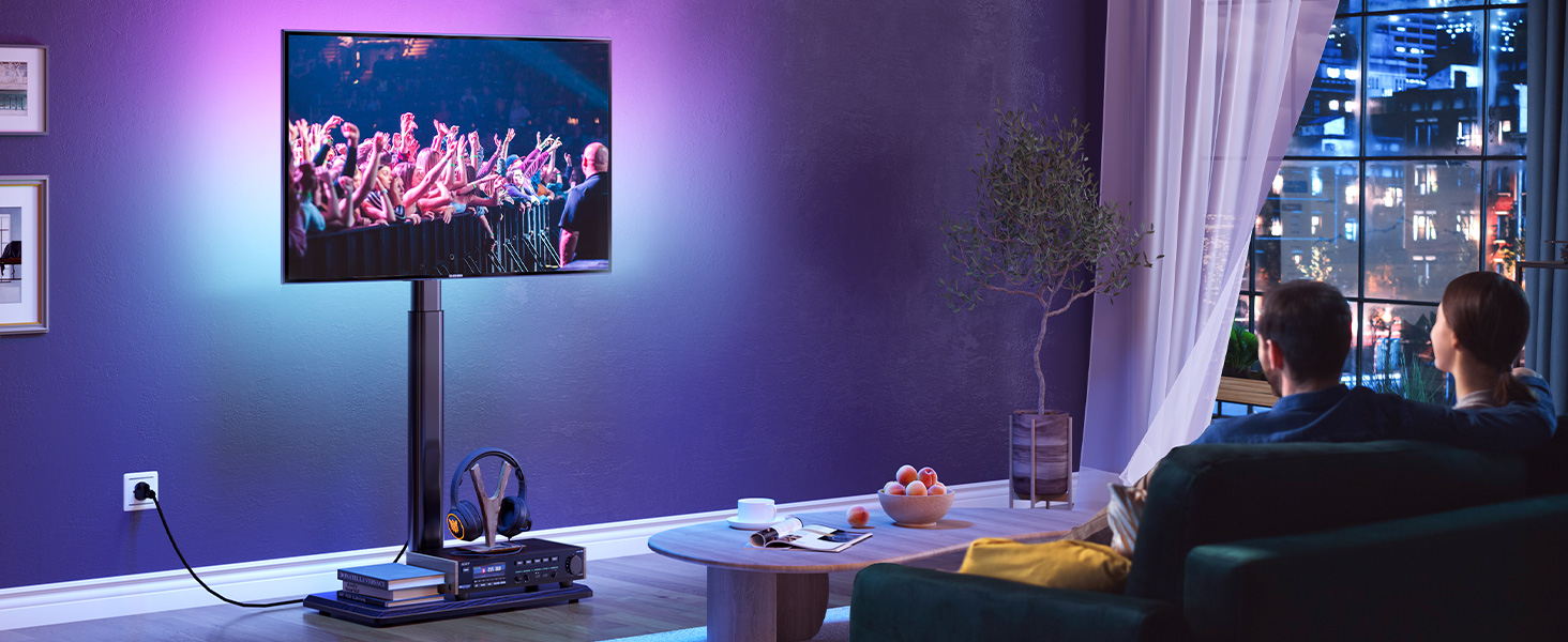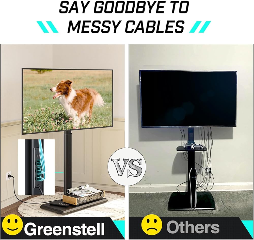 Integrated Power Outlet & Cable Management: Greenstell floor tv stand is equipped with 3 AC outlet(120V/12A), 2 USB ports (5V/2.4A)and a 6.5ft long power cord, plus four cable managements to keep wires organized and neat. No more messy cables or tangled wires