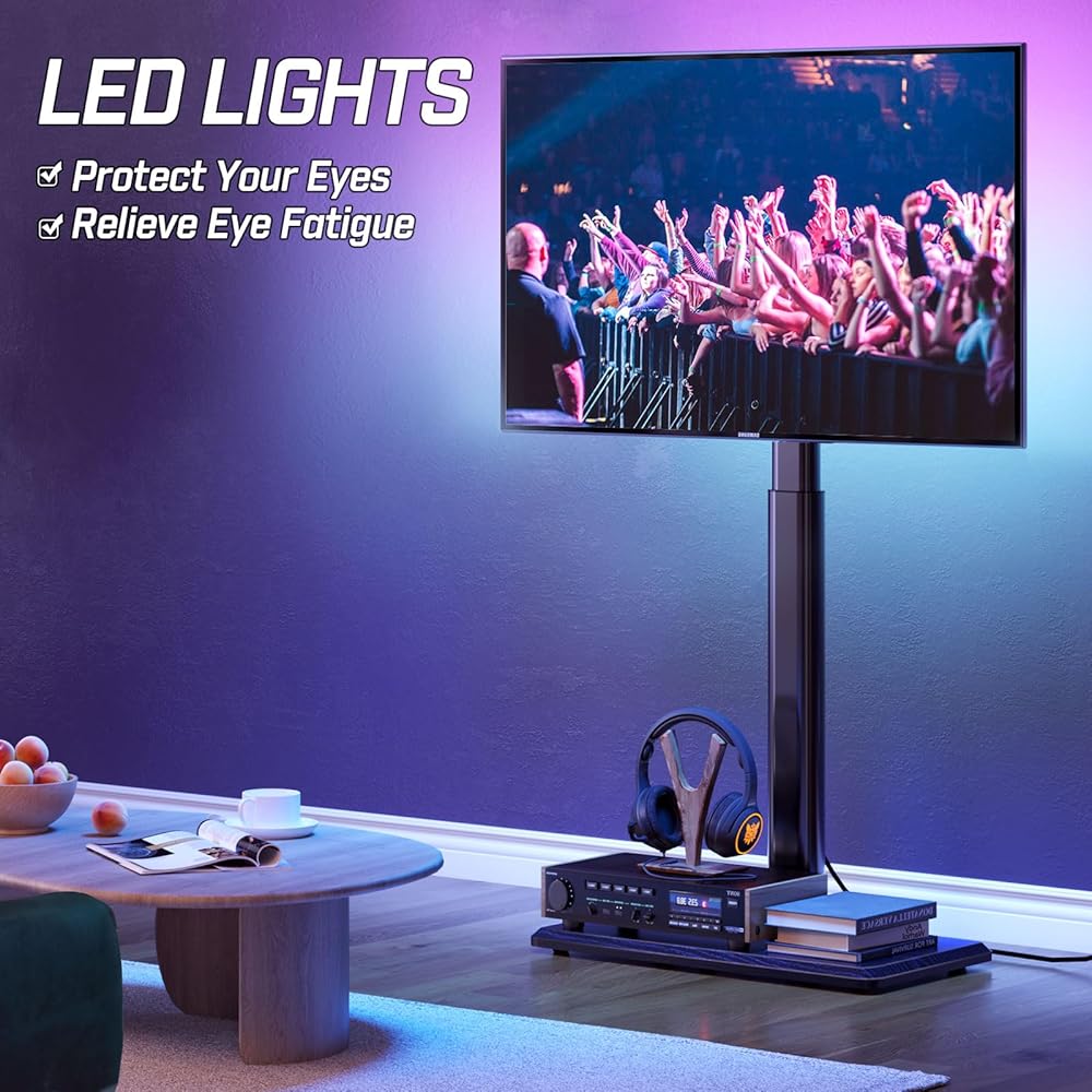 Greenstell TV Stand with Power Outlet & LED Lights, Floor TV Stand for 32-70 inch TV, Tall TV Stand with Solid Wood Base, Height Adjustable, Swivel, Holds up to 110 LBs, Max VESA 600x400mm