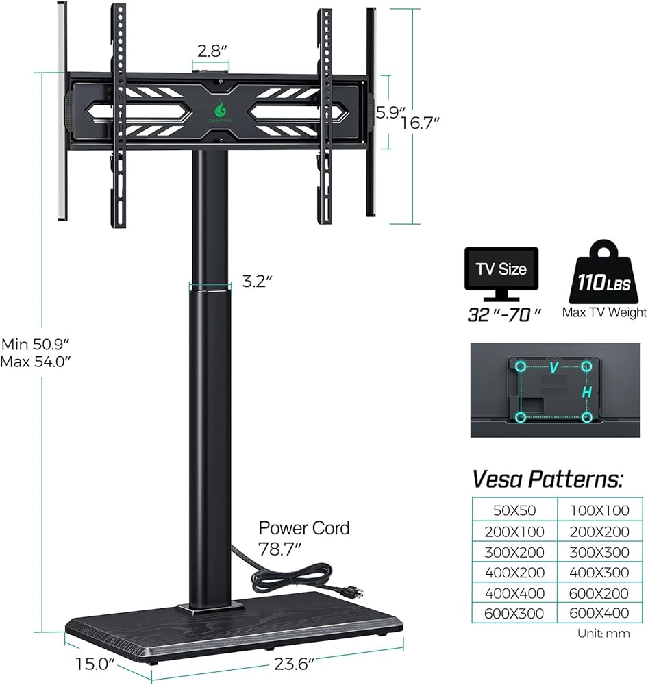 Wide Compatibility:Greenstell Floor TV stand fits most 32–70 inch LCD/LED/flat-screen/curved TVs (including 32″/ 39″/ 40″/ 42″/ 43″/ 48″/ 49″ /50″ /55″/ 60″/ 65″/ 70″) up to 110 lbs with VESA patterns 50x50mm to 600x400mm. Please verify the size, weight, and VESA pattern of your TV before purchase