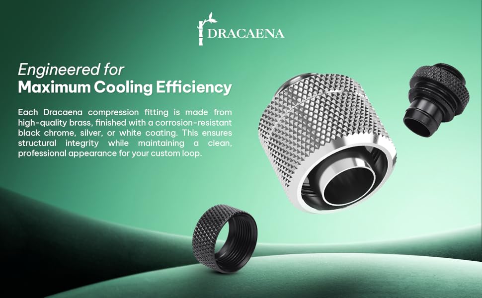 The Dracaena compression is a revolution in fitment design. It simplifies the process of setting up a liquid-cooling loop and provides a seal that outperforms traditional compression fittings. By using 4 preinstalled O-rings and an overhauled design, the fitting can satisfy your requirements perfectly. Dracaena soft tubing compression fitting consists of two parts, the main part is the base and it's very similar to the standard barb fitting, but it has an additional thread. The other part is the locking ring which screws on to the base of the fitting and it prevents the tubing from slipping off the barb.Advantages of Dracaena tubing: Compression fittings are popular because they do not require soldering, so they are comparatively quick and easy to use. Dracaena fitting doesn't require special tools or skills to operate. They work at higher pressures and with toxic gases. Compression fittings are especially useful in installations that may require occasional disassembly or partial removal for maintenance etc., since these joints can be broken and remade without affecting the integrity of the joint.They are also used in situations where a heat source, in particular a soldering torch, is prohibited, or where it is difficult to remove remains of water from inside the pipe which prevent the pipe heating up to allow soldering.Dracaena Compression fitting: Dracaena fitting is a solid-tube compression fitting, designed for use with solid tubing such as Acrylic, Copper, Stainless Steel or any other type of compatible hard tube.