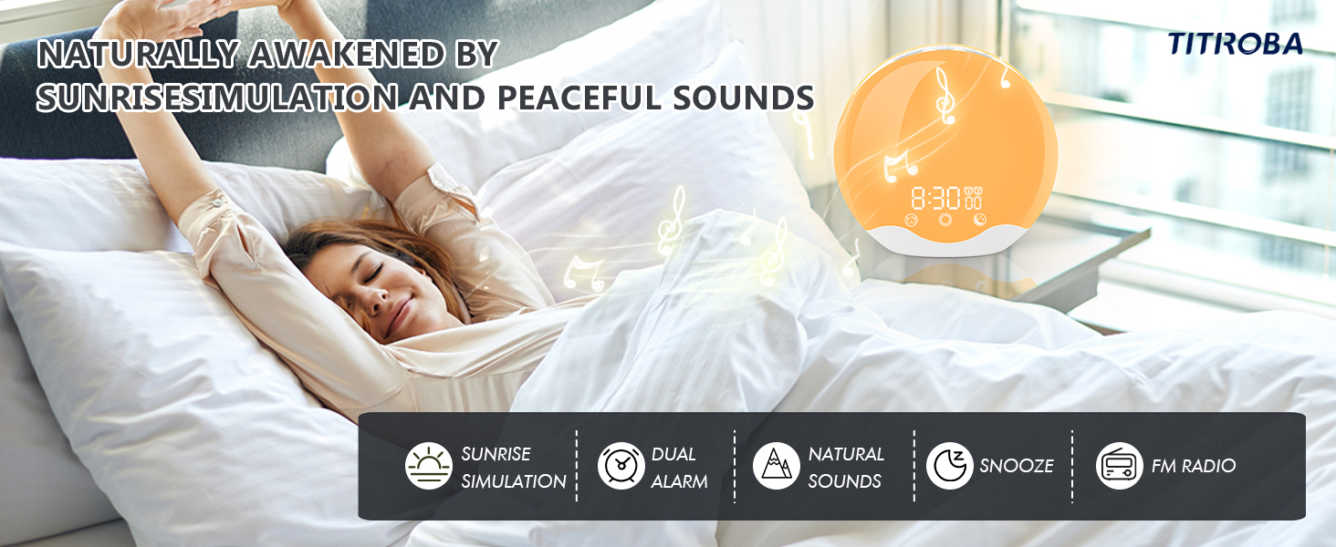 Wake You up by Sunrise Simulation: 10-60 minutes before the alarm time, the light gradually brightens to simulate a sunrise and wake up your body. 5 natural sounds and FM radio serve as the alarm to wake you up at the designated time. With 20 brightness levels and 20 volume levels, the light provides sufficient brightness and nice sound quality especially suitable for deep sleepers.