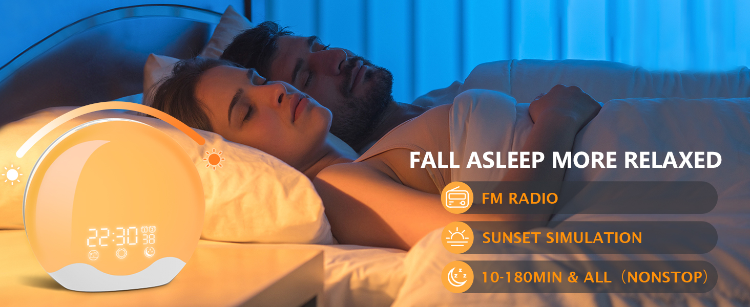 SunriseSleep Aid & FM Radio: Set a sleep timer for 10-180 minutes or unlimited, choose sunset simulation lighting or other colored lights paired with FM to help you relax. The light and sound will gradually dim and turn off towards the set time. Additionally, the wake-up light can be used as a radio and you can manually adjust the channel.