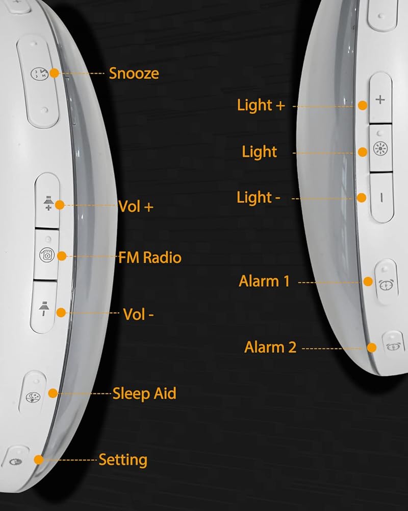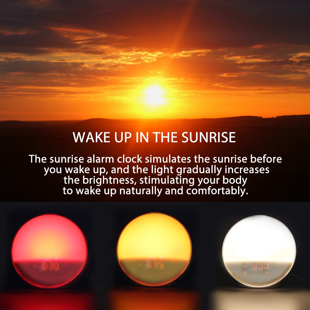 【Sunrise Alarm Clock with Snooze Function】The wake-up light will be on from 1% of the brightness to 100% at a set time to bring you out of deep sleep gently to welcome a refreshing day, and sunset function will guide you to natural, restful sleep. When the alarm clock sounds, it will last 15 minutes. Press "snooze" to get 9 more minutes sleep.