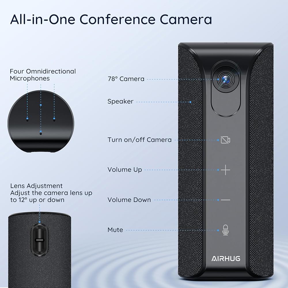 Immersive Sound Experience - AIRHUG 04 camera with the 5 watt speaker produces a nice crisp audio that's easily heard. You won't miss a word if you are at a meeting. With an LED light mode of AIRHUG 04 making your meeting convenient and easy to set up mute mode of microphone or volume up and down.You can enjoy the wonderful music or comfortable online conference, whether indoors or outdoors.It is good for 3-5 people conference.