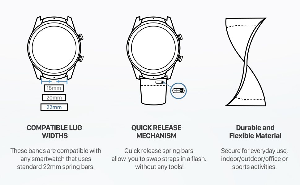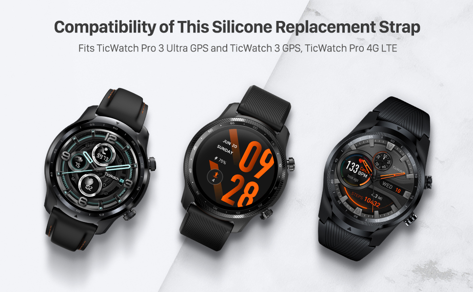 COMPATIBLE: Specially design for Pro 3 Ultra GPS/ Pro 3 GPS/ Pro 4G LTE/ Pro S2 E2, please kindly noted that it is not suitable for TicWatch S/E. And This watch strap is also compatible with any traditional or smart watch that uses 22mm, please make sure the lug width of your watch before order.