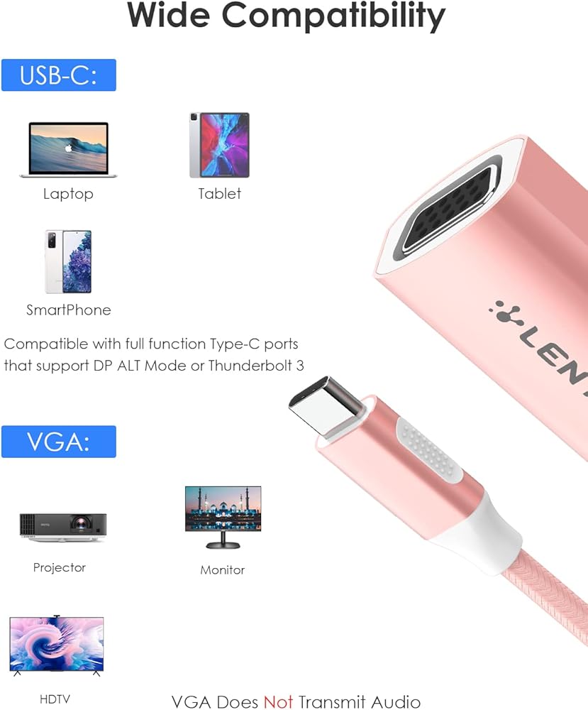 【USB C to VGA Adapter】Max resolution output is 1920x1080@60Hz, downward compatible with 1080i, 720p, 576p, 480i / 480p. (Note: VGA only supports video output, for both video & sound output, please consider LENTION CB-CU607 USB C to HDMI Adapter (4K/60Hz) from us)💕Note:💕If the VGA didn't work, generally considering compatibility issues, please contact us, we will sovle the problem within 24 hours on working days.