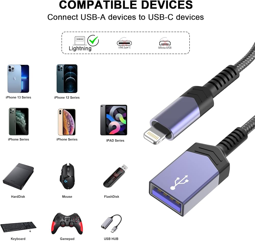 🧡【Wide Compatibility】: This Lightning to USB Camera adapter is compatible with iPhone 14/14 Pro/14 Pro Max/13/13 Pro/13 Pro Max/12/12 Pro/12 Mini/Xs/ Xs Max/ X/ 8/ 8 Plus/ 7/ 7Plus/ SE and iPad Air / Mini..Supports standard photo formats like JPEG and RAW, along with SD and HD video formats including H.264 and MPEG-4.