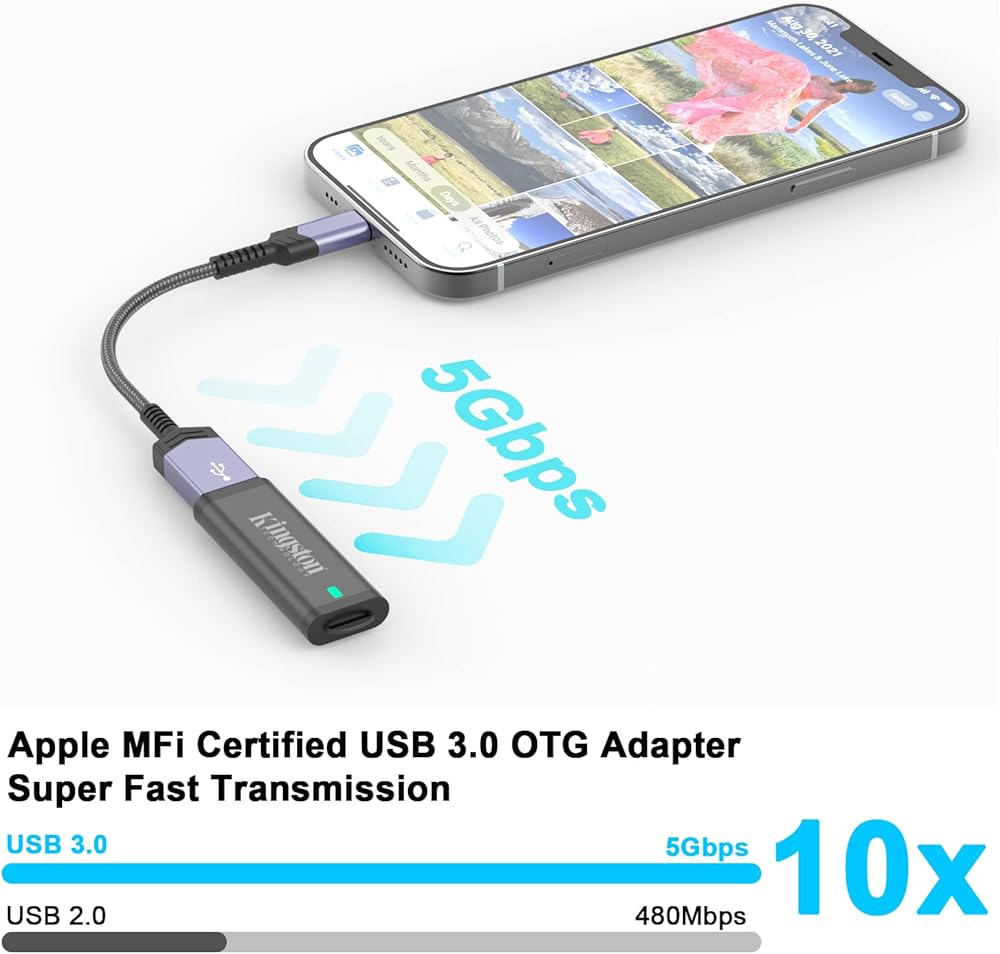 ❤【Lightning to to USB 3.0 Adapter】: The Apple MFI certification Lightning to USB 3.0 Female features full USB 3.0 super speed data transfer up to 5Gbps, 10x faster than USB 2.0. It transfers files, HD movies, and songs to your iPhone and iPad in seconds.