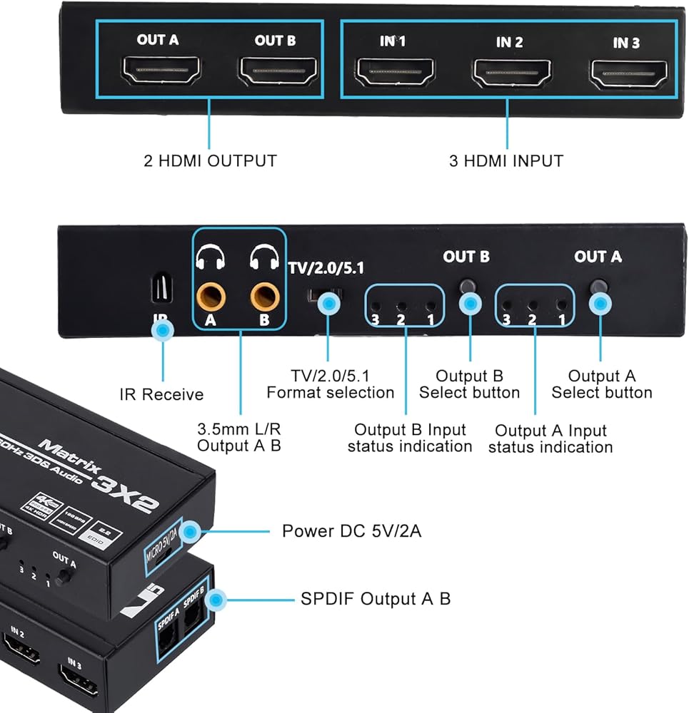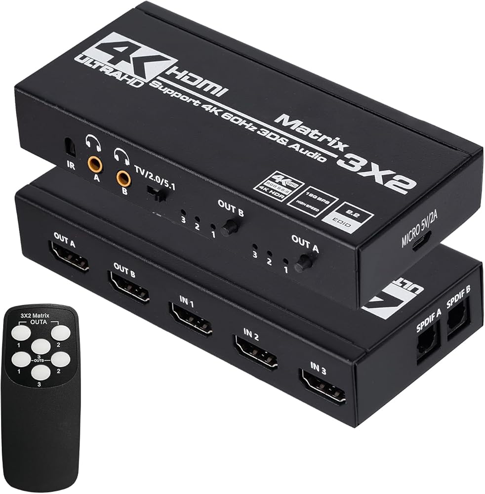 HDMI Matrix 3x2: This HDMI Matrix Switch can connect three 4K HDR signal sources to 2 HD display or monitor,and it can also extract the HDMI input Audio signal with Toslink SPDIF optical fiber or 3.5mm stereo headphone output. This 3x2 HDMI Matrix can control by IR remote control and Local Button. It allows 3 HDMI Output devices to be switch or split easily to two HDMI compatible monitors or projectors.