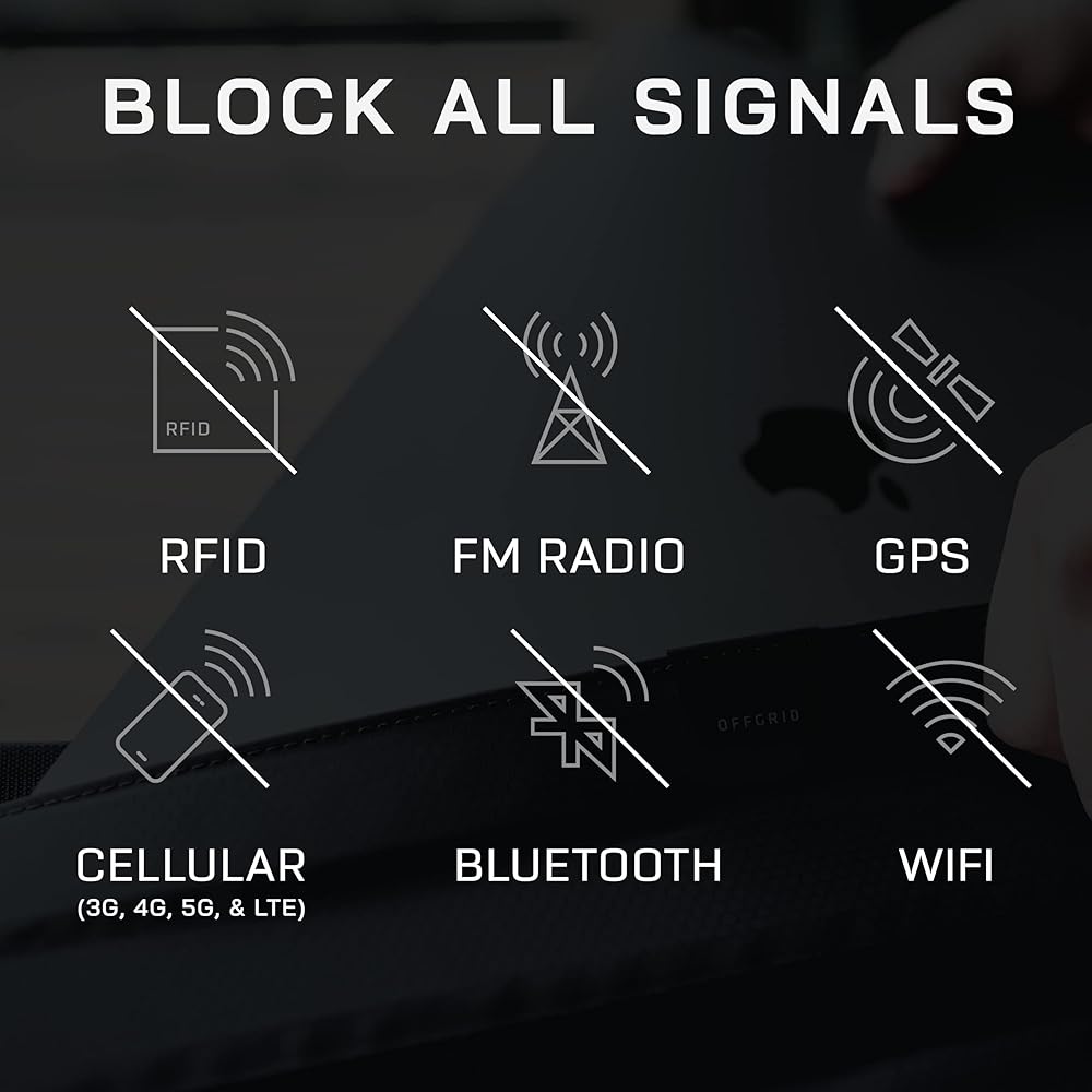 ONE BAG TO BLOCK IT ALL- Protects devices from a wide range of invasive signals including RFID, FM Radio, GPS, Cellular, Bluetooth, 5G, and Wifi. Prevents location tracking so users can enjoy freedom off the grid.