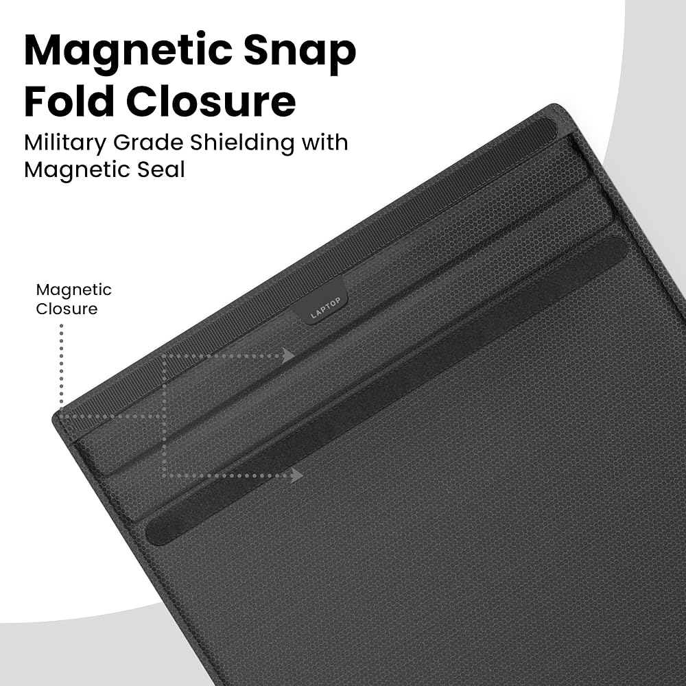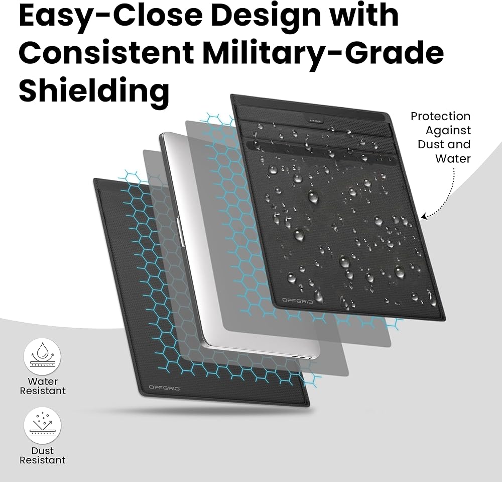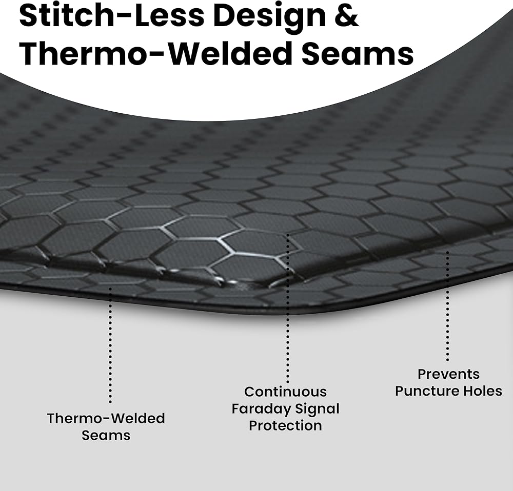 DURABLE CONSTRUCTION- Quad-layer Faraday material, water and dust resistant ripstop, single-fold magnetic seal, additional lining, and thermo welded stitchless seams eliminate gaps to maximize shielding strength.