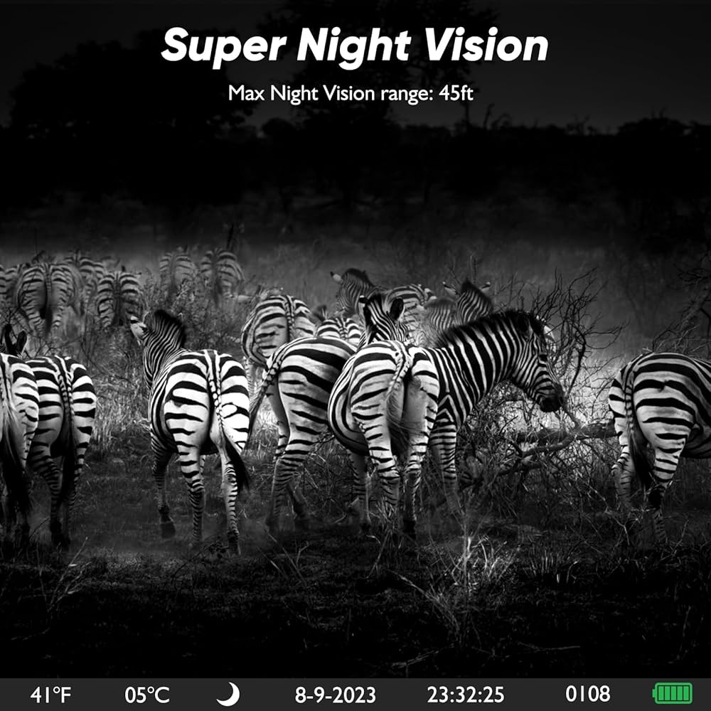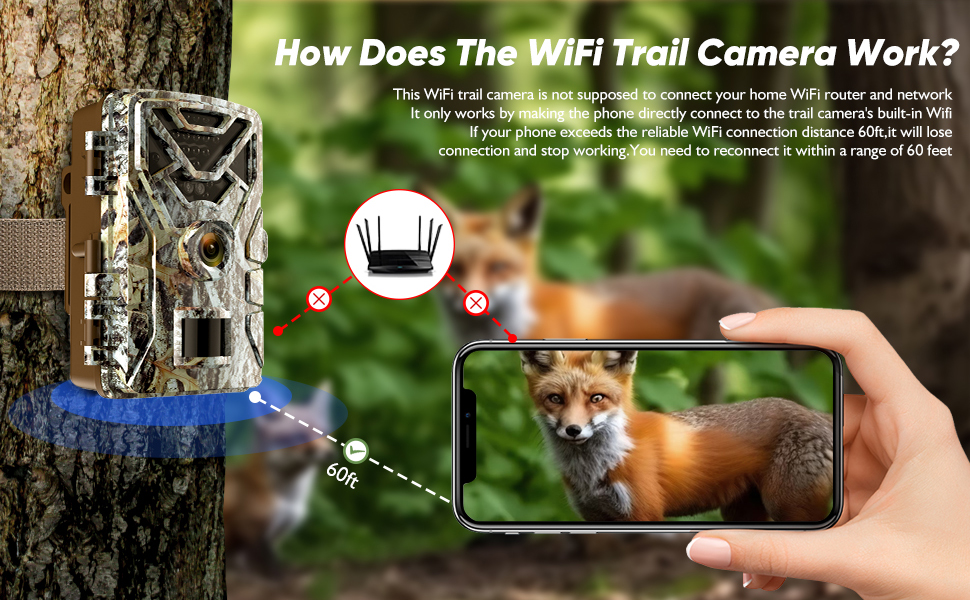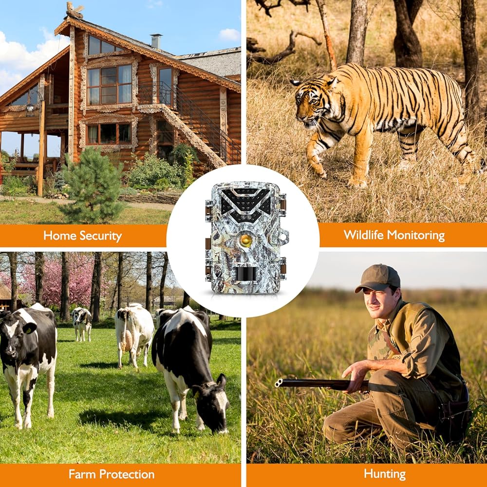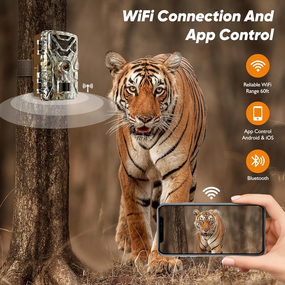 【Wider Range of Trigger & Faster 0.2S Trigger Speed】This wifi trail cam has a wider detection angle of 120°.Once motion is detected, the wifi game cam will trigger with a shutter speed as fast as 0.2s without delay, so you won't miss any moment whether it's for wildlife watching or home security.