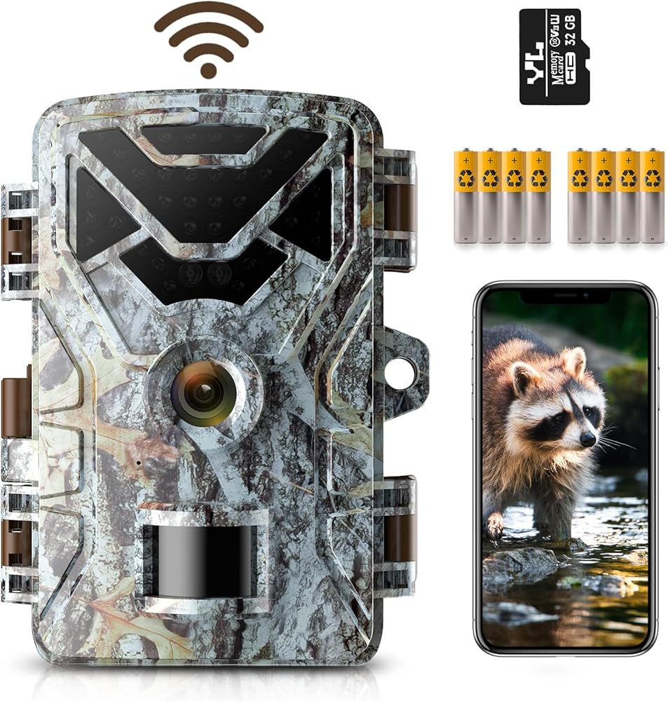 【IP65 Waterproof & Multiple application】This wifi trail game camera has plastic case and silicone sealing ring.It reaches the waterproof level of IP65,which is extremely suitable for field shooting.Besides,this wildlife camera can also be used as home security surveillance, surveillance warehouses, farm guards. Package includes 32GB Micro SD card and 8 batteries. This trail & game camera is equipped with everything you need.