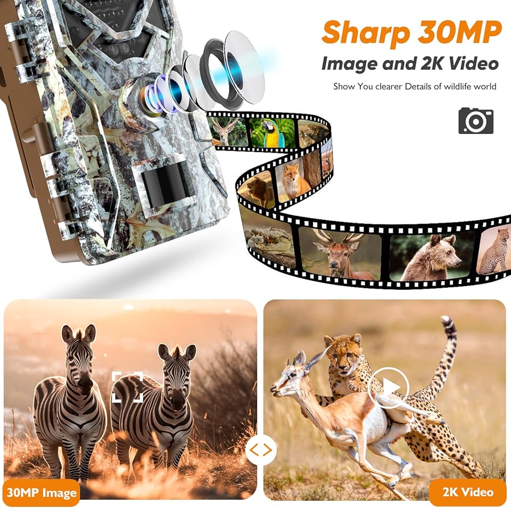 【2K FHD Video Recording + 30MP Clear Photo 】The wifi game camera can record 30MP crystal clear images and 2K resolution video with sound. And this wifi hunting camera has a built-in 2.4 inch HD screen. You could preview videos and pictures directly without having to download them first. Of course, you also could do the same thing by your mobile phone.All you need to do is stay within the Wi-Fi signal range(60ft).