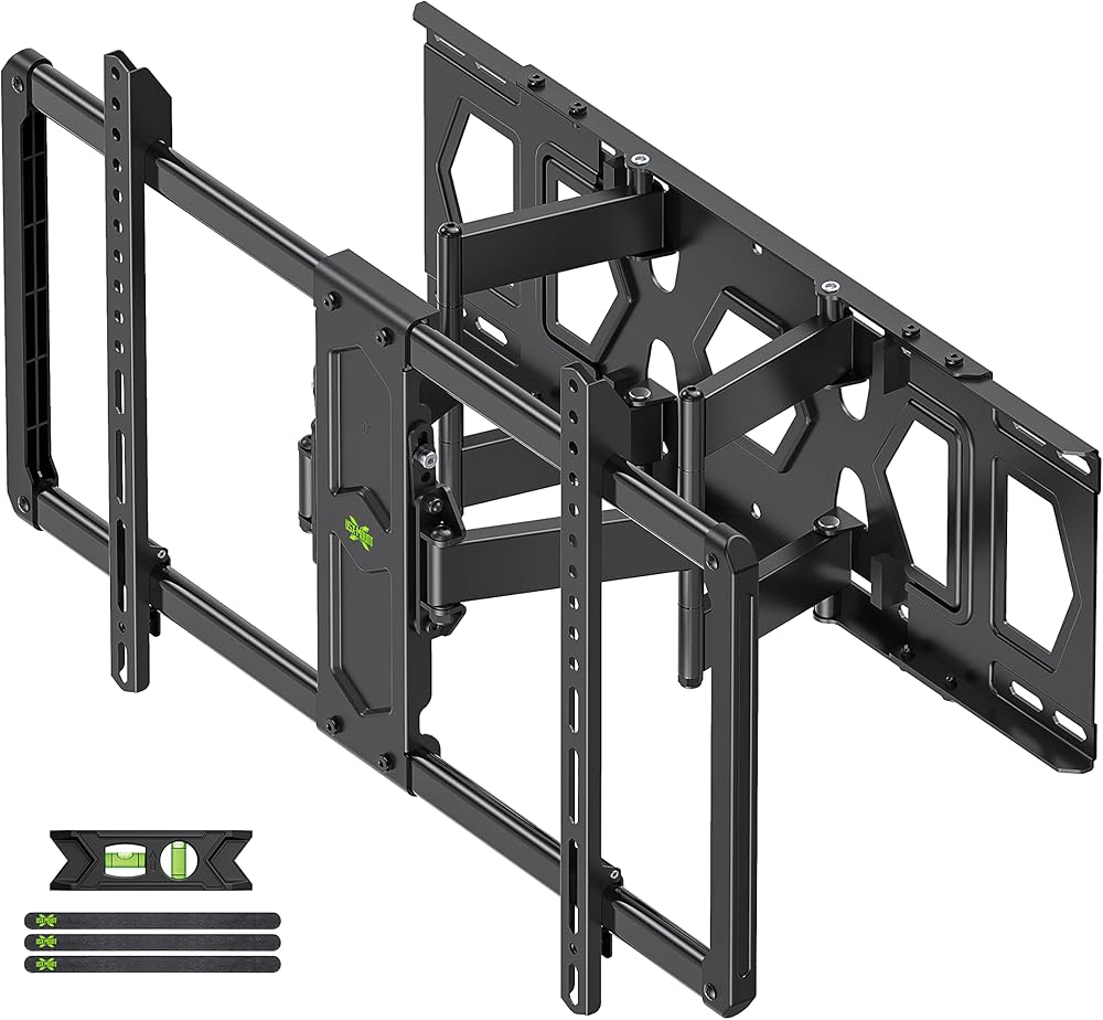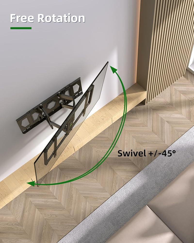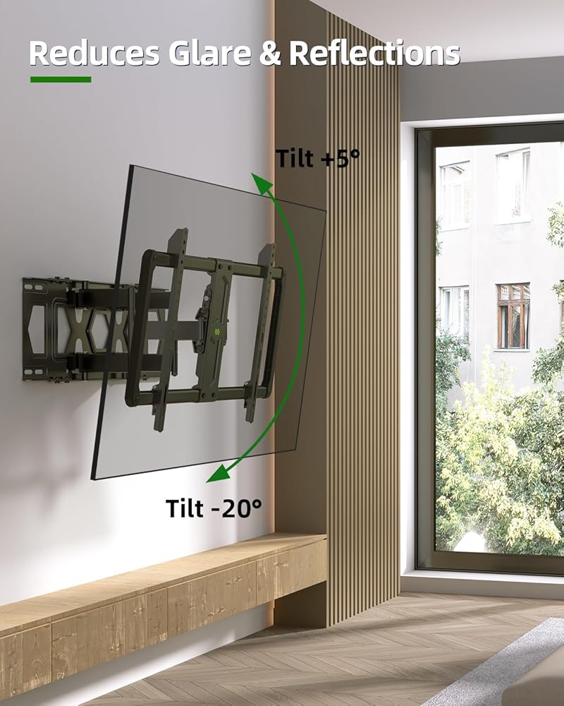 ✅ [Adjustable viewing comfort & Glare reduction] Our TV wall mount with double articulating arms includes +5°/-20° tilt, ±45° swivel (maximum swivel angle depends on your TV), and mounting adjustments allowing perfect TV leveling. All of these features will make your TV flexible, say goodbye to annoying glare, and allow for better viewing depending on your seating in the room.