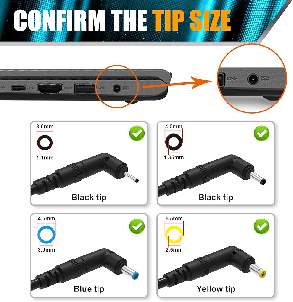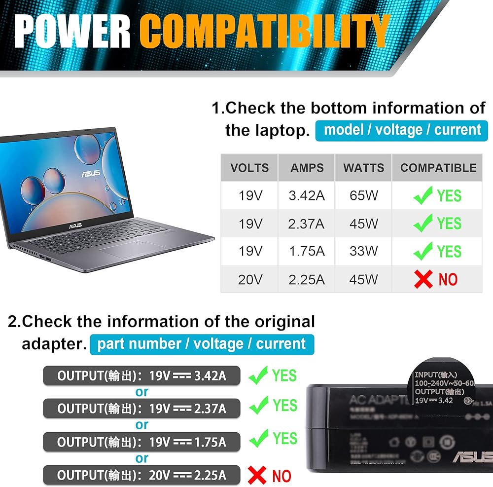 [ Specification ] This universal laptop charger can replace most 65W 45W 33W Asus laptop.65W charger for Asus Laptop can be used for 3.0x1.1mm, 4.0x1.35mm, 4.5x3.0mm, 5.5x2.5mm charging connectors. Output DC: 19V~3.42A for 65W, 19V~2.37A for 45W, also compatible for 19V~1.75A 33W.