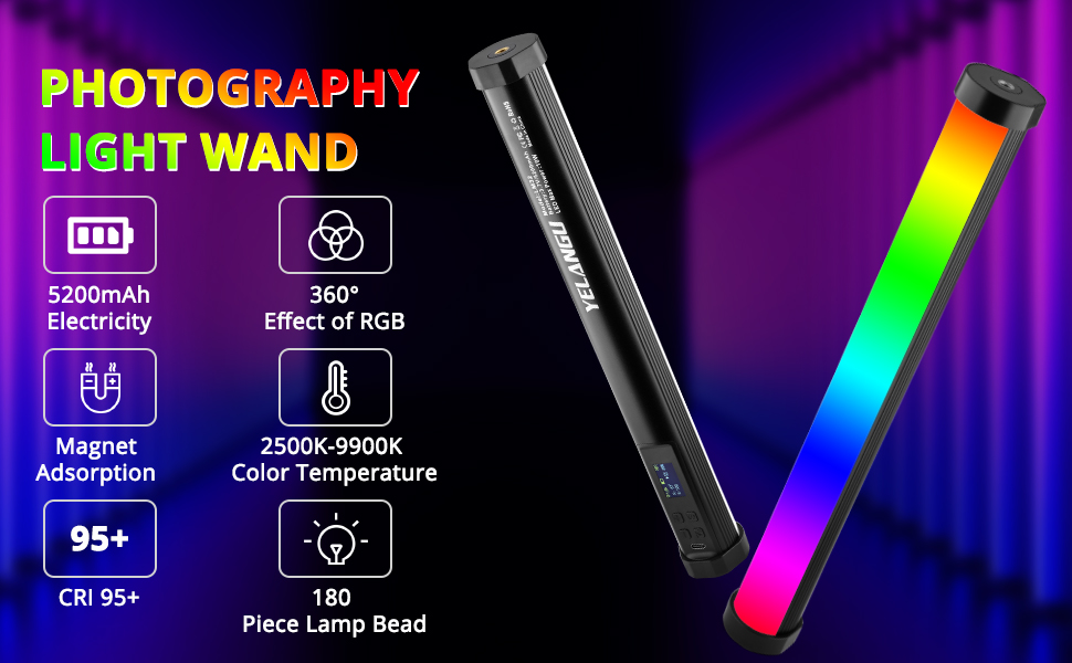 【Handheld RGB Light Wand】LED light stick with aluminum alloy body, sturdy and durable, high-grade sense,adopting 180 high color rendering led beads with max power 10w,2500k-9900k color temperature 1200 lumens(0.5m) 360° full color CRI 95+.only weighs 310g/0.68lb.RGB light apply to portrait, live streaming, ambient lighting and light painting photography etc.