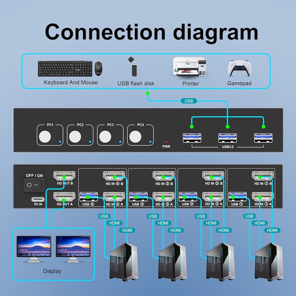 【4 USB 2.0】 This HDMI dual monitor KVM has 4 USB 2.0 ports, which can share USB devices, such as scanners, USB printers, U disks, etc., and can automatically identify and match various display devices, making your work more convenient.