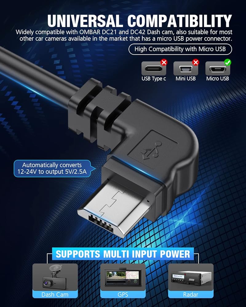 【Wide Compatibility】This mini usb cable hardwire kit is suitable for most car models(Voltage between 12-24V). OMBAR USB hardwire kit works for almost all car mini USB device, such as dash cam, mirror cam, GPS navigator and radar detector, etc