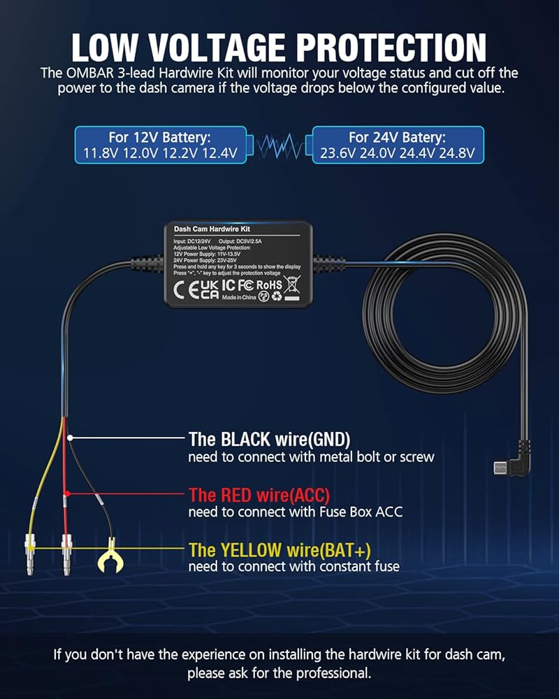 【Warranty & Support】The dash cam hardwire kit comes with a full 12 months warranty, if you have any question regarding your product, please do not hesitate to contact us via Amazon, after-sale service is 7/24 on standby.