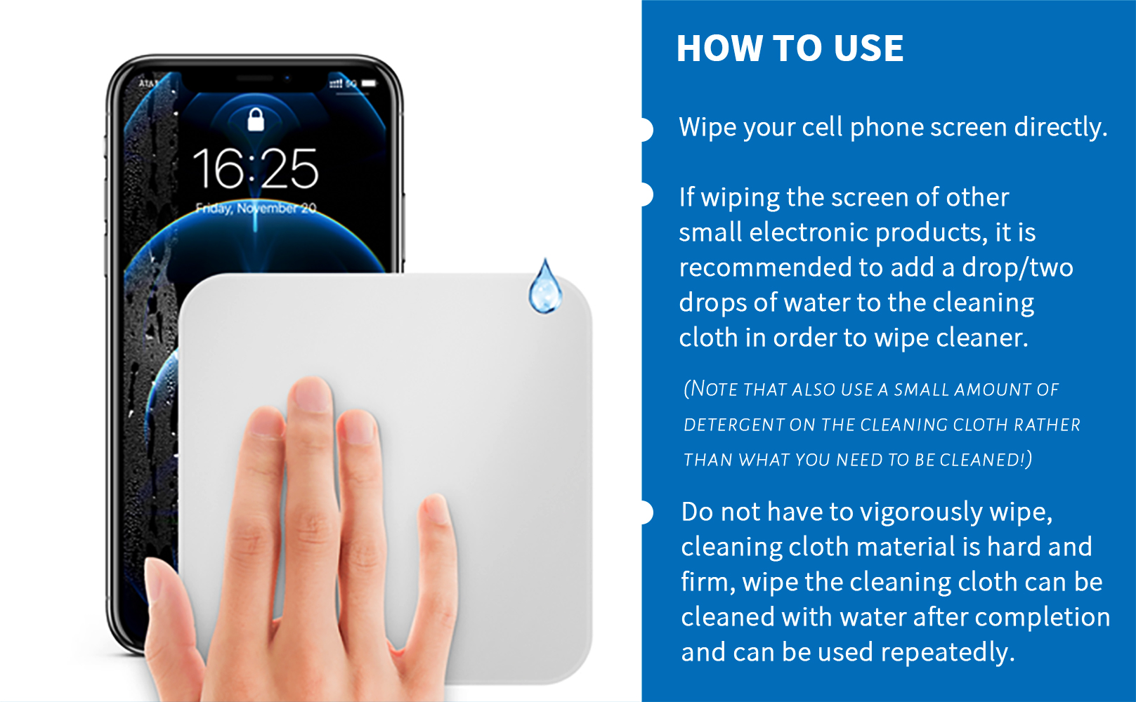 【How to use】1). Wipe your cell phone screen directly. 2). If wiping the screen of other small electronic products, it is recommended to add a drop of water or two drops of water to the cleaning cloth in order to wipe cleaner. (Note that you can also use a small amount of detergent) 3). do not have to vigorously wipe, cleaning cloth material is hard and firm, wipe the cleaning cloth can be cleaned with water after completion and can be used repeatedly.