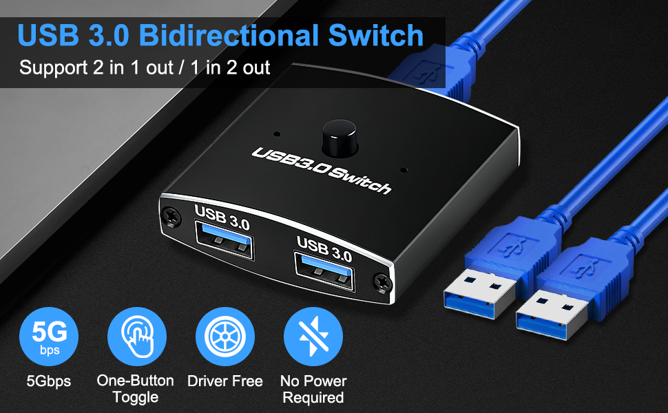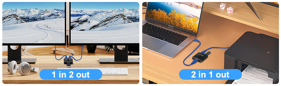 【USB 3.0 Bidirectional Switch】2 in 1 out / 1 in 2 out optional,This USB switch allows you to share 1 USB device between two computers or share one computer between 2 USB devices, such as printer, scanner, mouse, keyboard, and other USB devices. High quality aluminum shell is more durable, anti-fingerprint, and accelerates heat dissipation.