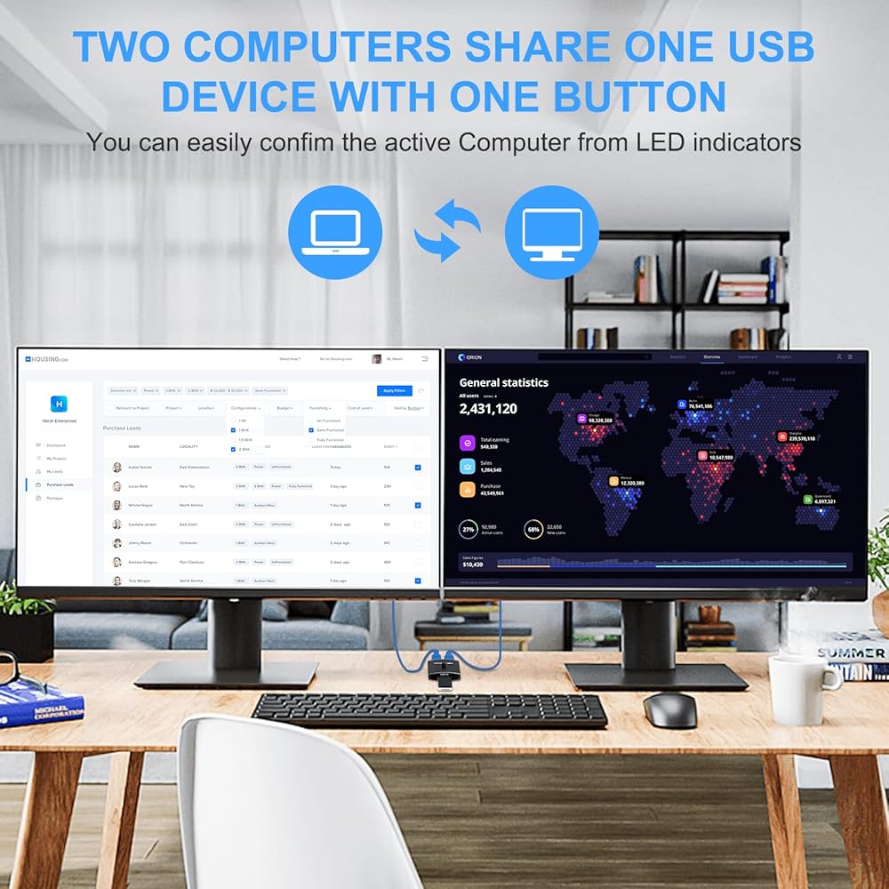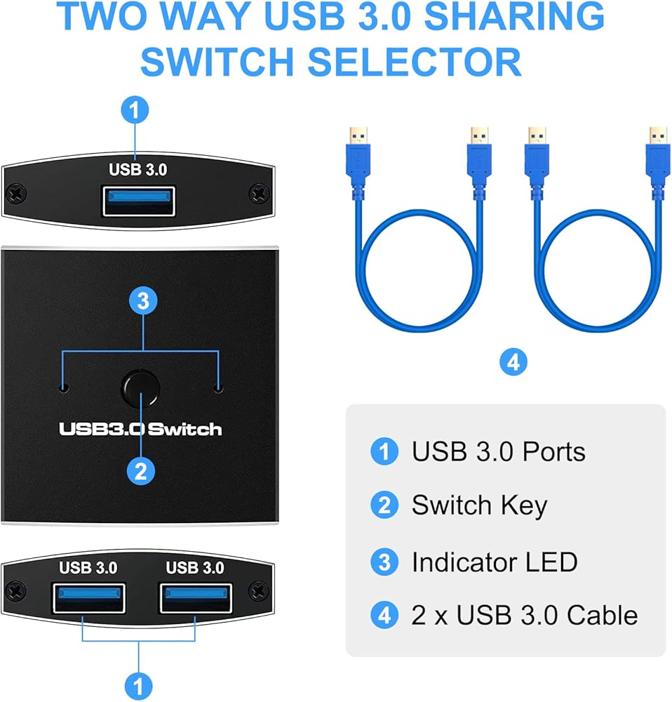 【Easy to Use】: Designed for efficient multitasking, our USB 3.0 Bidirectional Switch is driver-free,Windows, Mac OS, Linux, Plug and Play, no drivers to install, and LEDs to indicate usage status. Switching between two computers has never been easier, allowing you to work faster and more efficiently.