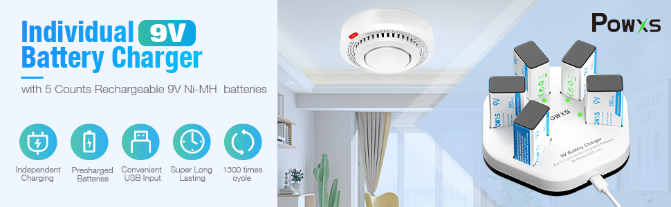 Upgraded 9V Rechargeable Batteries and Battery Charger Set: Included 5 count long lasting rechargeable 9V Ni-MH batteries and a 5 bay smart 9V battery charger.