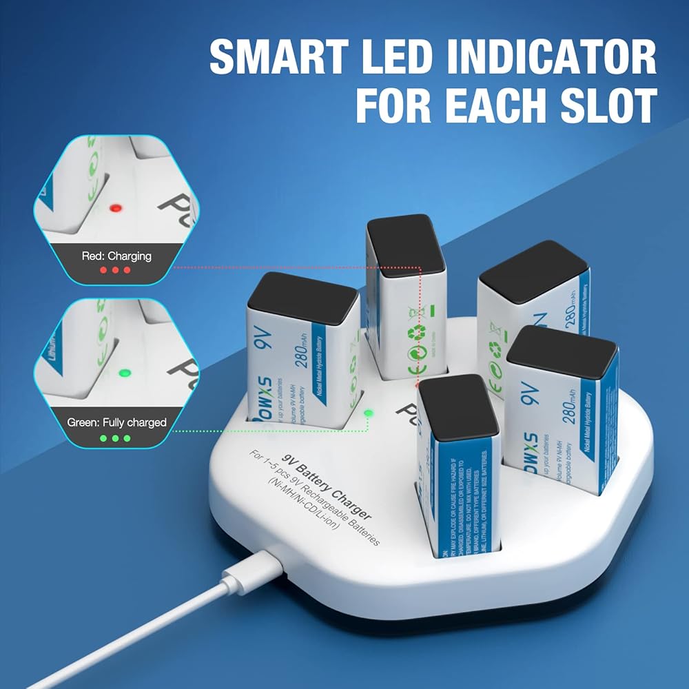 🚀 مصباح LED واضح يظهر تقدم الشحن: يُظهر مصباح LED حالة الشحن الحقيقية لبطاريات 9 فولت، وميض أخضر - شحن، ضوء أخضر - مشحونة بالكامل.