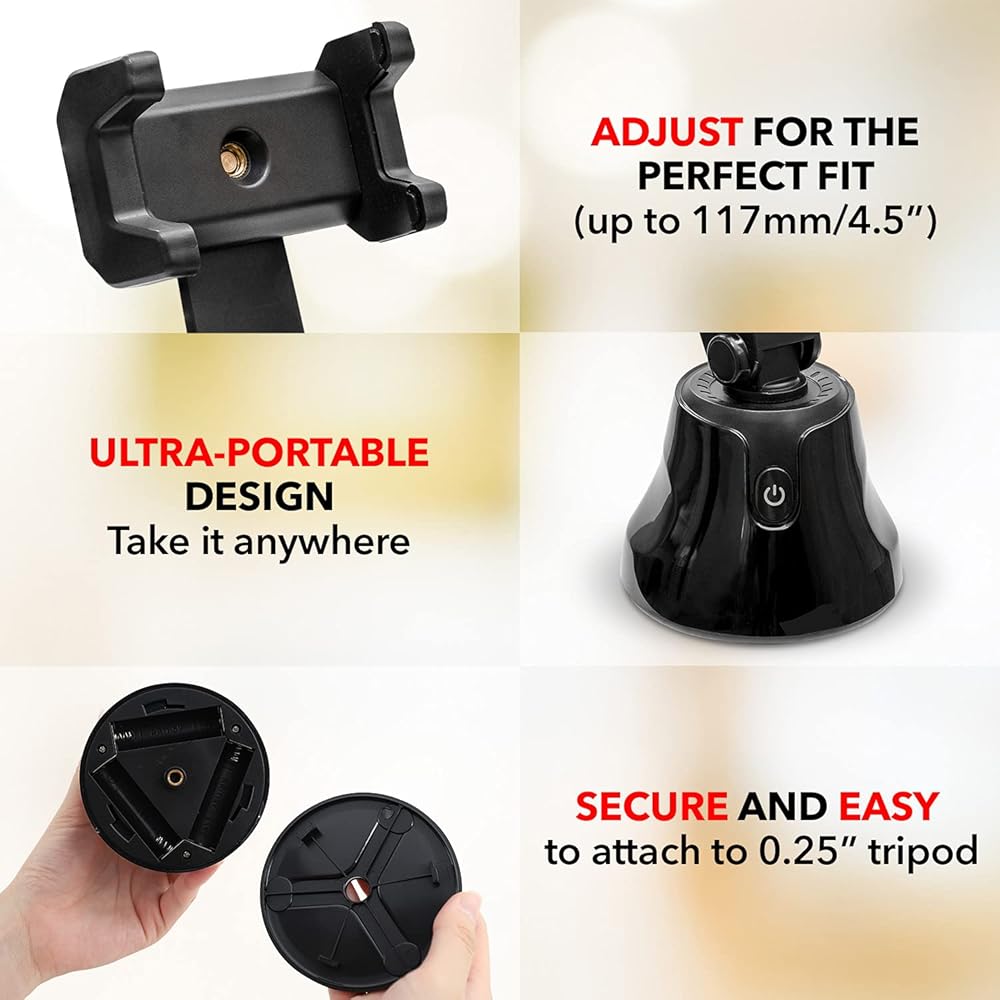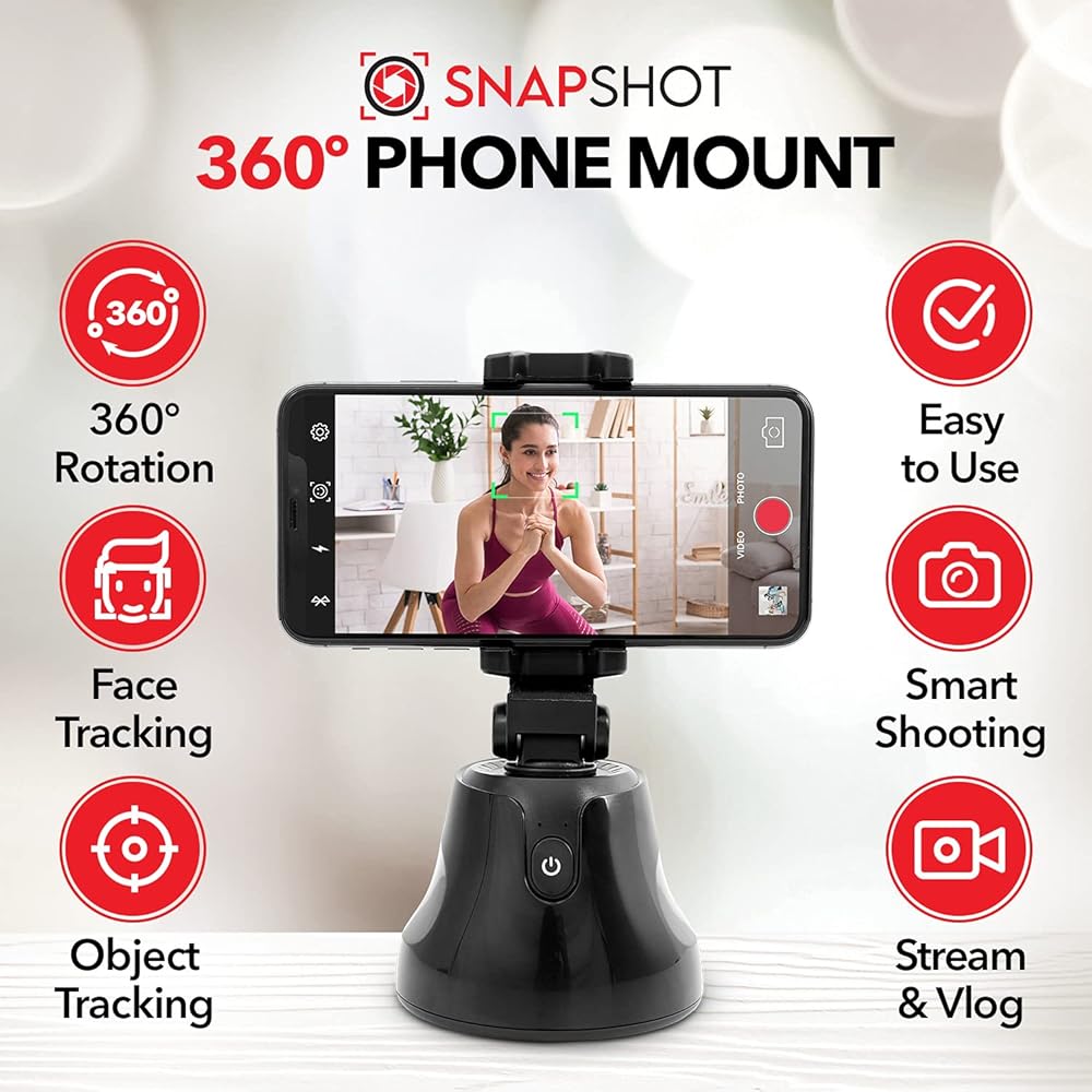 PHONE HOLDER WITH SMART TRACKING TECHNOLOGY - This 360 tracking phone holder grips your phone firmly and uses 360 motion tracker phone technology to smoothly take recordings and photos. Never worry about shaky video recordings or blurry photos ever again with the Snapshot auto tracking phone stand.
