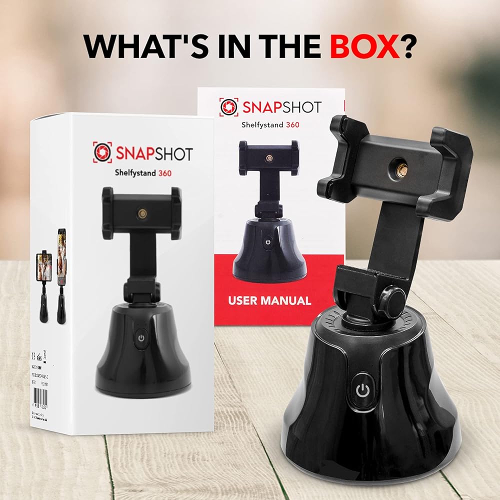 SNAPSHOT SHELFYSTAND 360 PHONE TRACKER TAKES YOUR PHOTOS AND VIDEOS TO THE NEXT LEVEL - Capture the perfect photo or live recording with the Snapshot Shelfy Stand 360, equipped with a motorized motion sensored phone video tracker, manual tilting, and a Bluetooth shutter that connects to your smartphone.