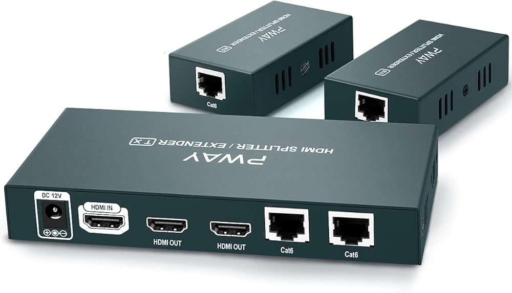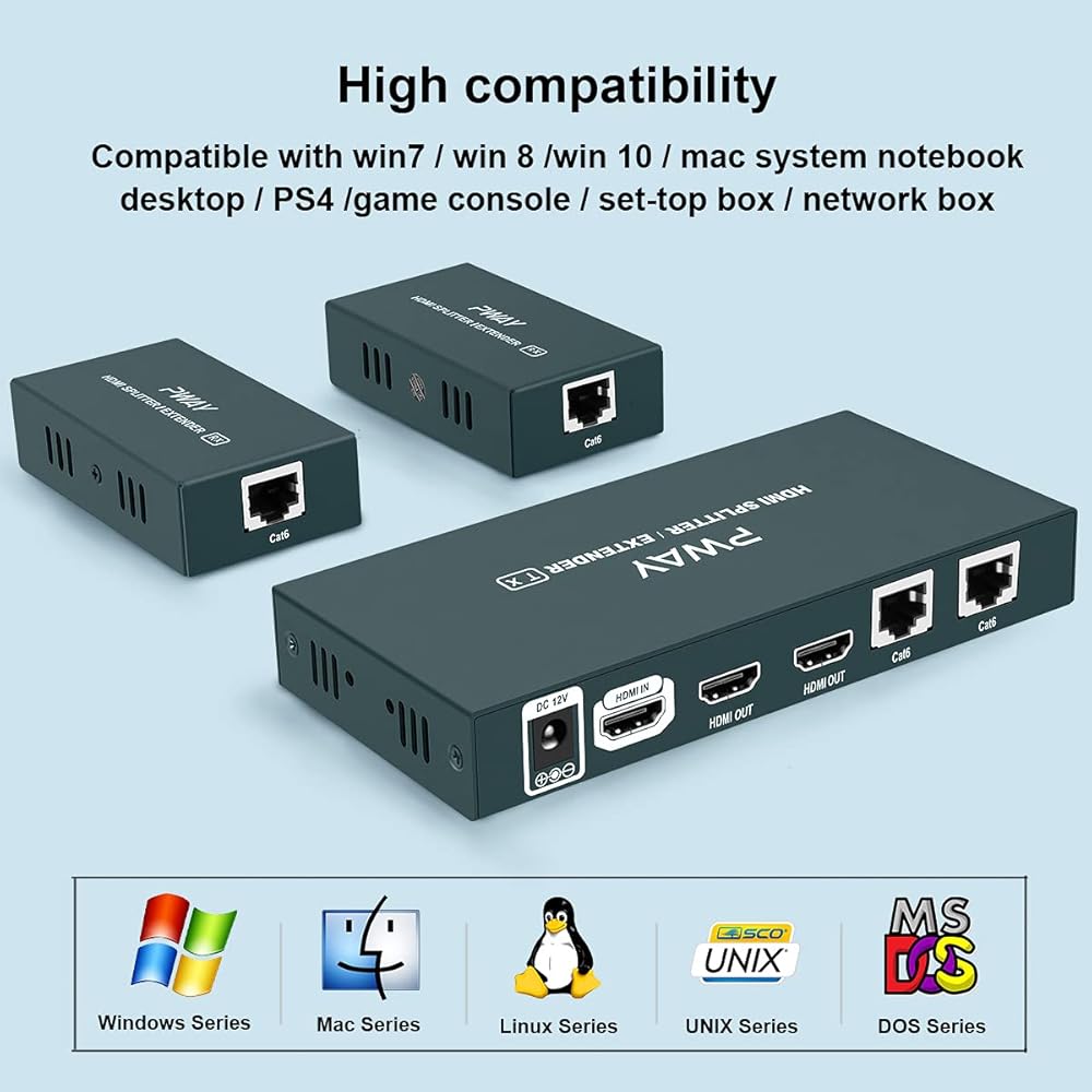 HDMI Extender with 2 port HDMI Splitter This HDMI network extender allows a single HDMI device to be broadcast to up to two remote displays over Cat5e/6 or better LAN cable at distance up to 50m(165ft), Lossless Transmission.