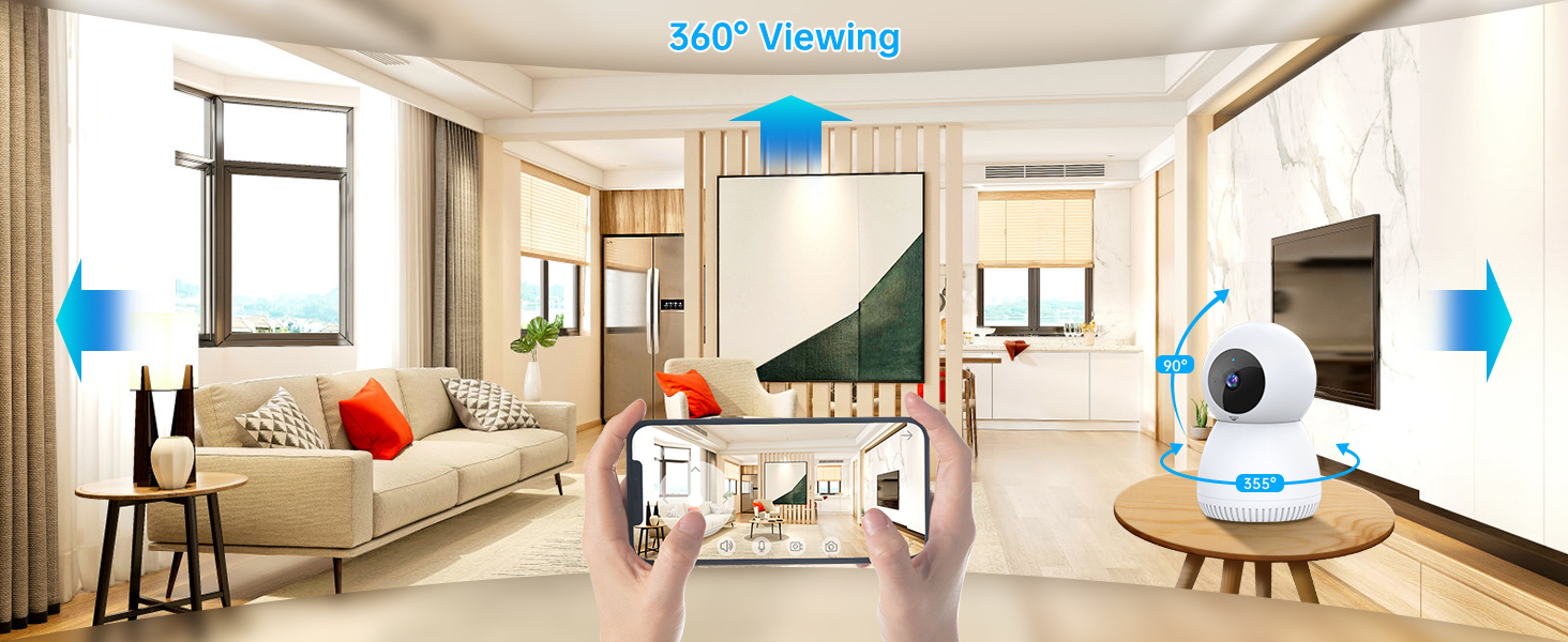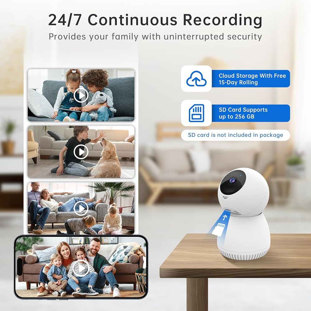 【Motion Detection & Real-Time Alarm】Security camera indoor wireless with motion tracking function, if it detects someone in your home or a moving object. Home security cameras will follow the moving object to rotate, and at the same time, send real-time alarm push to your cell phone. Pet camera with phone app will automatically retain 10-15 seconds of alarm video to cloud or SD card and save it for 24 hours, so you can know what's going on in your home every moment.