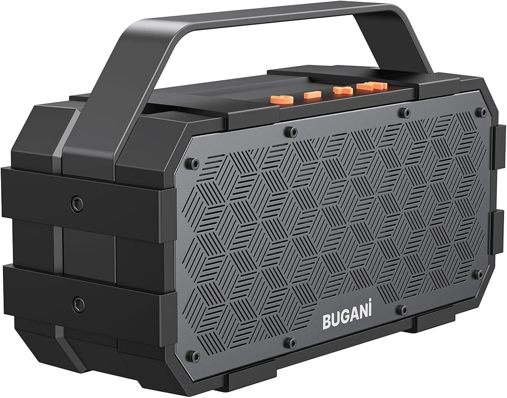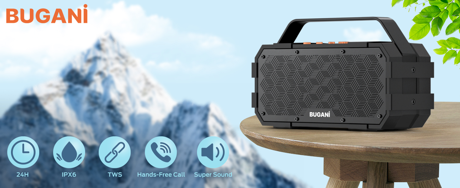 【 IPX6 Waterproof Protection & Stronger Construction 】With IPX6 waterproof, the Bugani party speaker can resist water splash, spray, and rain, just take it outdoors anywhere, it accompanies you on adventures, and sing and dance together. This wireless speaker is durable and shockproof enough to withstand a few bumps and bruises along the way thanks to its front and back metal grills, built for adventure.