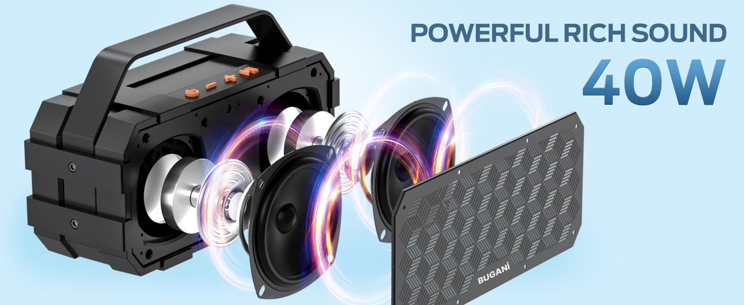 【Superior Sound & Punchy Bass】Bugani Bluetooth speakers are equipped with 40W of stereo audio drivers and double 3-inch passive bass radiators, which pump out crisp treble, detailed mids, and specially enhanced bass at any volume. Configuration with loud stereo sound output devices that can play perfectly without distortion even at maximum volume.