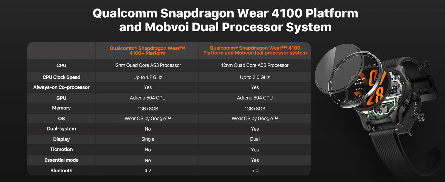 【Updated Chipset, Better Experience】Wear OS by Google Ticwatch Pro 3 Ultra GPS smartwatch with the Qualcomm Snapdragon Wear 4100 Platform and Mobvoi Dual Processor System. Deliver faster and smoother performance and connectivity. 1G RAM and 8G ROM Memory. NFC payment supports Google Pay.