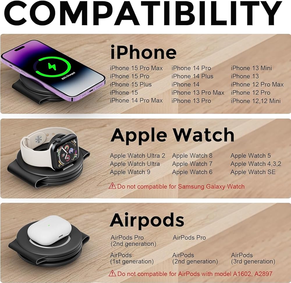 SPECIFICATION-This BEGTRO 3-1 magnetic wireless 15W charger provides fast wireless charging Compatible with iPhone 15/15 Plus/15 Pro/15 Pro Max Iphone, iPhone 14, iPhone 14 Plus, iPhone 14 Pro, iPhone 14 Pro Max, iPhone 13, iPhone 13 Pro, iPhone 13 Pro Max, iPhone 13 Pro Max, iPhone 13 mini, iPhone 12, iPhone 12 Pro, iPhone 12 Pro Max, iPhone 12 mini aipod 2/3/pro iWatch series