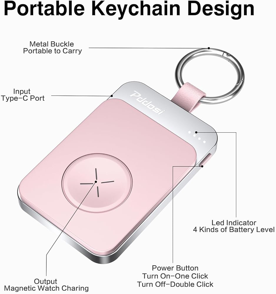 【Portable Key-chain Design】Our portable charger for iwatch is perfect for traveler on-the-go. Car key-sized watch charger power bank is lightweight 1.8oz with thickness only 0.5in, handy and compact size is quite convenient for you to carry out in your purse, pocket, or a bag when at work, travel, business trips, camping, and a sturdy metal keyring allows for easy attachment to your bag or backpack, make your travel easier