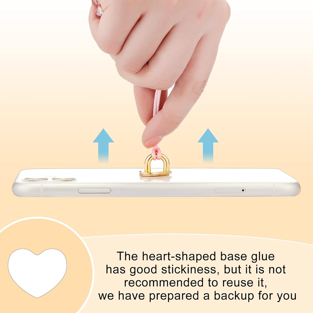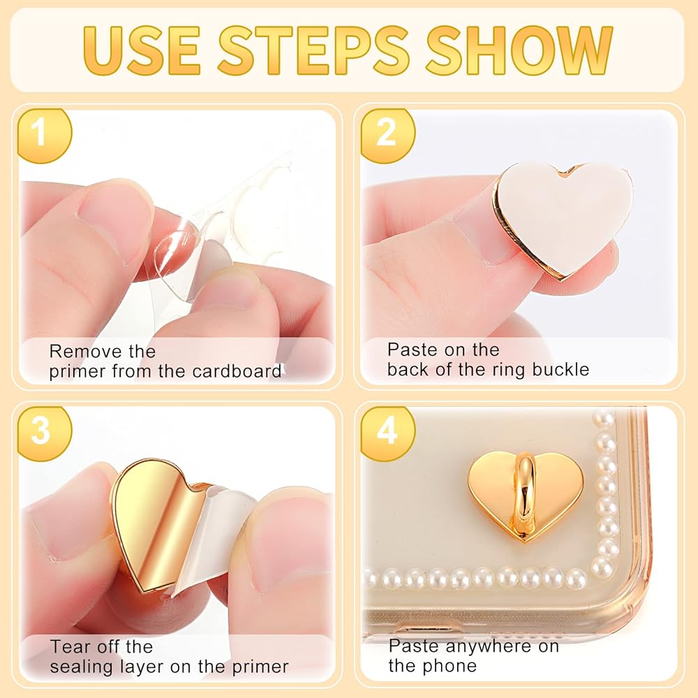 Peel and Stick: you only need to tear off the self adhesive heart shaped bottom sticker, stick this holder grip on the metal surface of the hook, you can get a cute ornament, which is convenient and fast; It is worth noting that after fixing the ring to the phone, do not pull it because the adhesive will not be sufficiently sticky for the next 24 hours