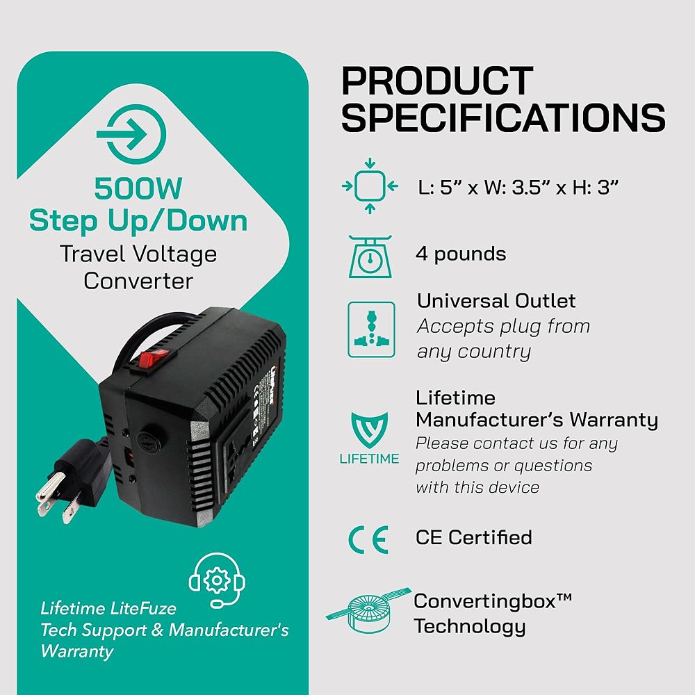 LiteFuze 500 Watt Step Up/Step Down Travel Voltage Converter, 220/110v to 110/220v converter with Type B Plug – Compatible with Hair Straightener, Camera, Laptop & More