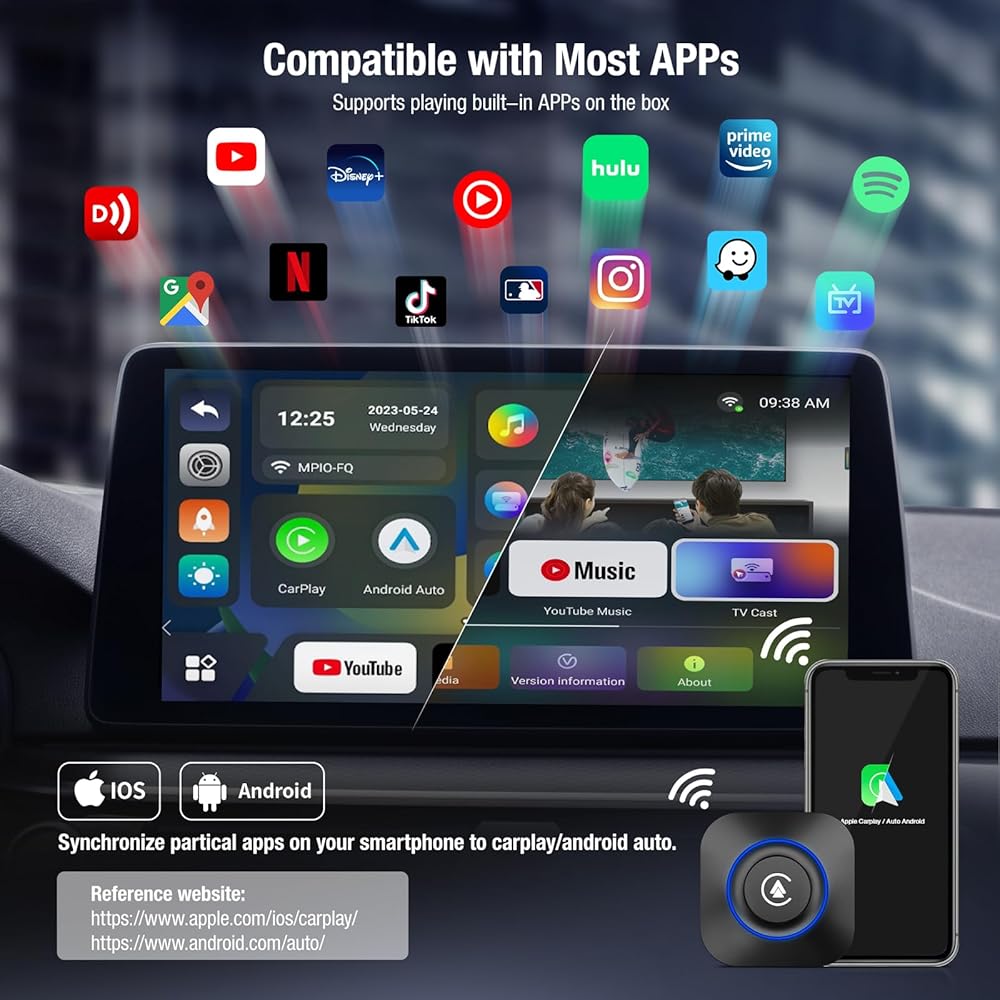 Universally Compatibility and Professional Support - As wireless carplay adapter, it compatible with all cars with factory OEM Wired Carplay. Wireless Apple Carplay and Android Auto work well with IOS 9+ and Android 10+. As wireless HDMI display dongle, it supports devices including iPhone, iPad, MacBook, Samsung, Huawei, laptop, tablet, etc. If there is any problems with our Carplay dongle, just consult to our professional customer service. We'll take care of everything for you.